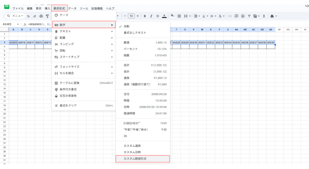 2.表示形式>数字>カスタム数値形式をクリック